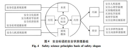 笔者从安全标语的本质、内容、展现载体和应用 4方面来阐述安全标语的安全科学理论基础,各方面所涉及的重要二级安全科学原理,如图 4 所示。具体解释如下: